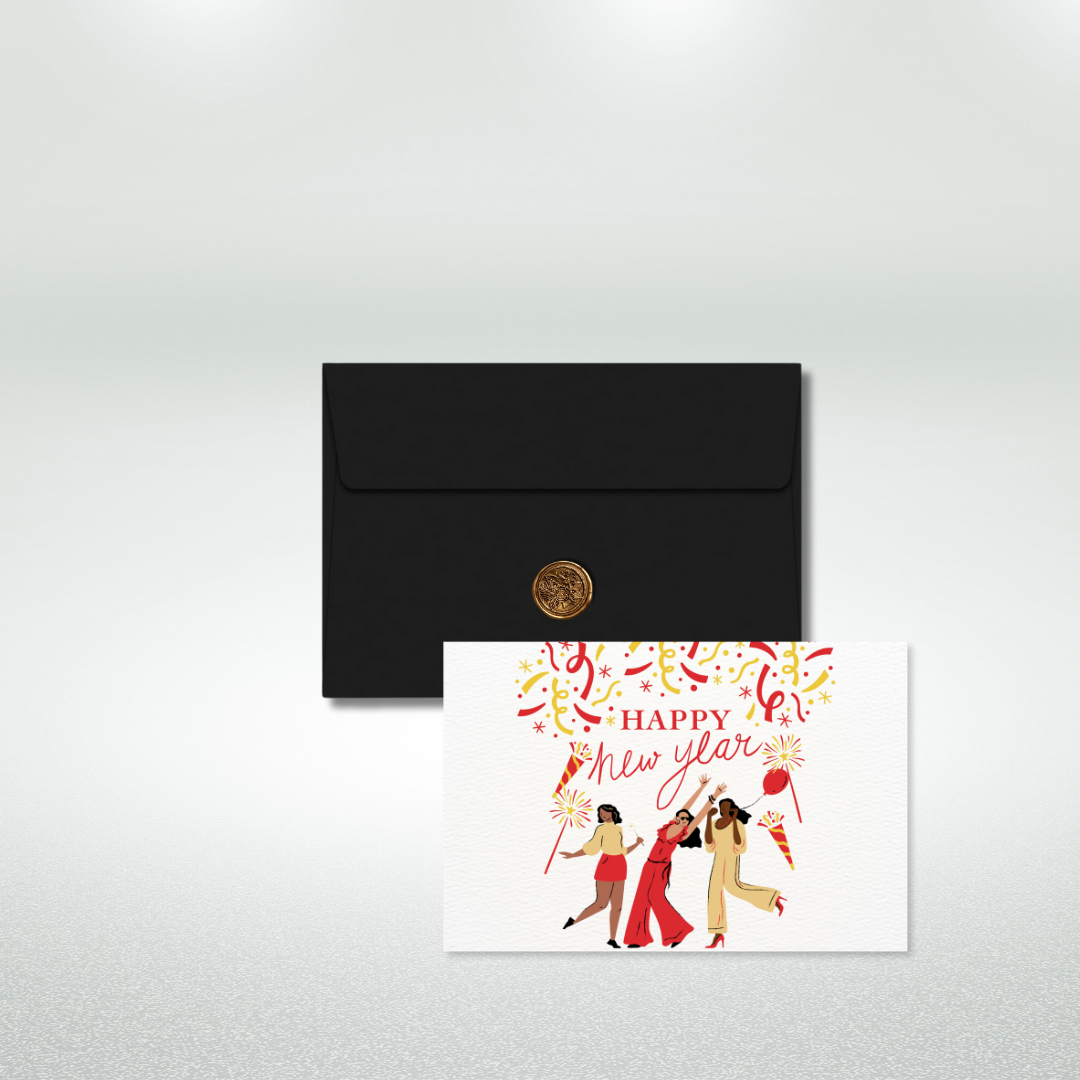 Ring in the new year with excitement and optimism, celebrating fresh beginnings and endless possibilities in this festive card! This card comes with a black envelope with a premium emerald green, envelope liner. Feel free to send out with an envelope or mail this postcard with a stamp to the recipient.