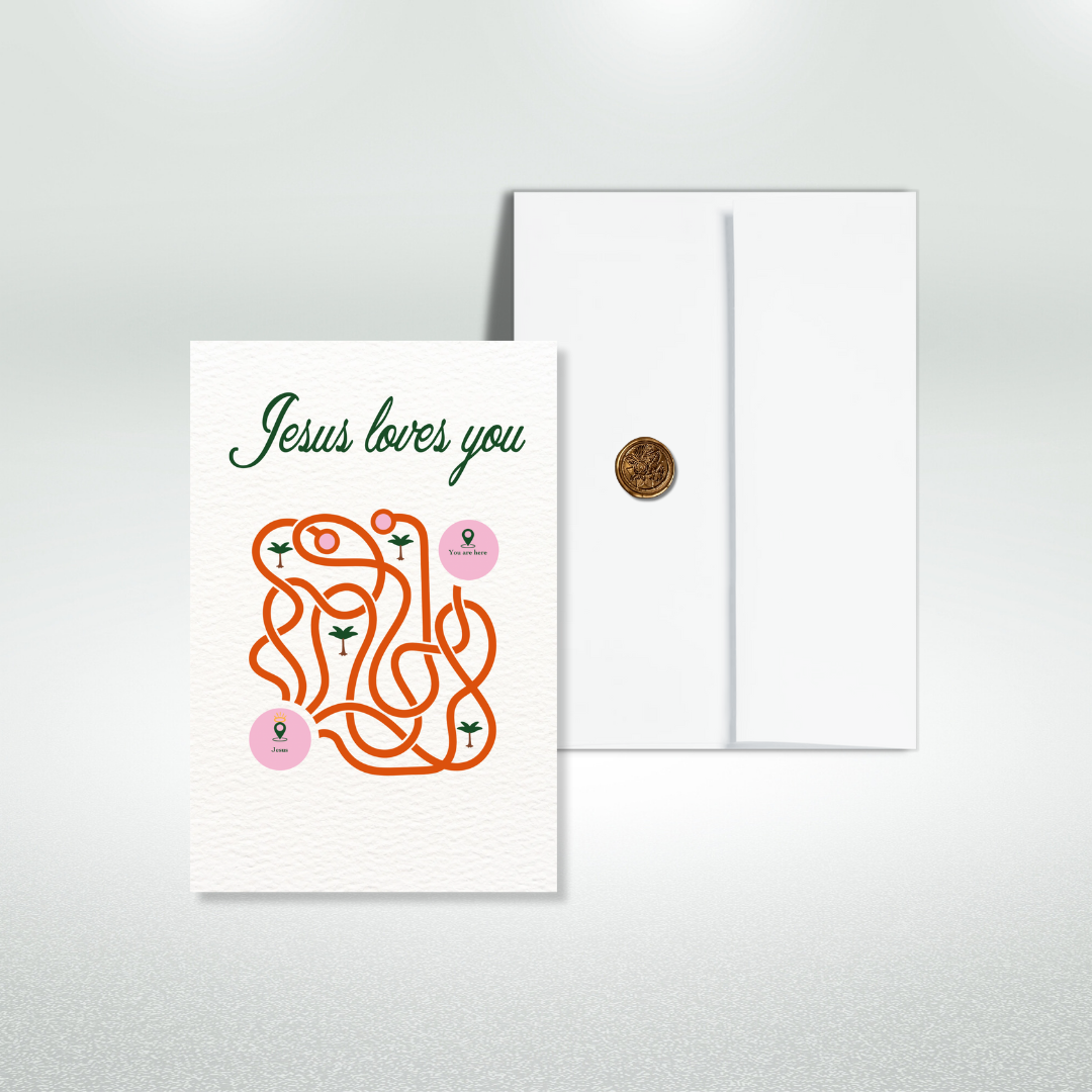 A card to share the love and encouragement of Christ. This tropical themed maze is the perfect way to encourage a loved one and even a stranger. This card is a reminder they are loved, seen, and pursued by Christ. This card comes with a white envelope with a premium emerald, green watercolor envelope liner.